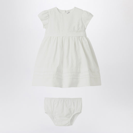 Round-neck dress by Il Gufo in white viscose poplin, characterized by short puff sleeves, a wide skirt with a horizontal pleated pattern at the bottom, an internal cotton slip with a tulle ruffle, a zip closure at the back, and elastic culottes.