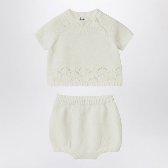Set by Il Gufo in organic cotton in milk white colour, consisting of a crew neck knit with short sleeves, perforated workmanship, buttons on the front, and shorts with elastic at the waist and ribbed edges.