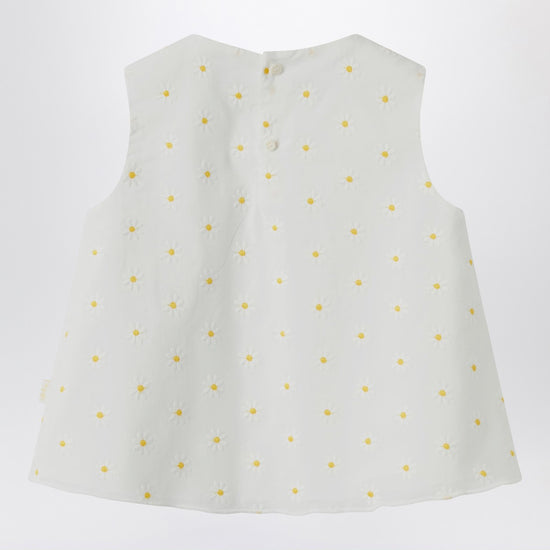 Sleeveless crew neck top by Il Gufo in white cotton, characterized by all-over floral embroidery, double-layer design, and button closure at the back.