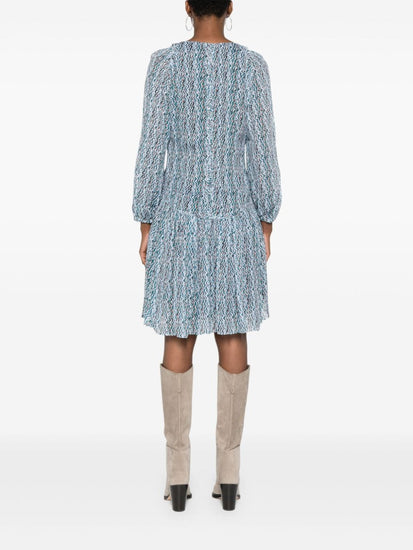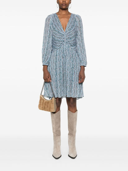 turquoise blue-green/multicolour cady texture all-over graphic print V-neck semi-sheer sleeves elasticated cuffs gathered detailing pleated skirt full lining curved hem above-knee length Ruline short dress Size and Fit - This piece fits true to size. We recommend you get your regular size. Model is 1,75m / 5ft 8in wearing size 36 (FR)