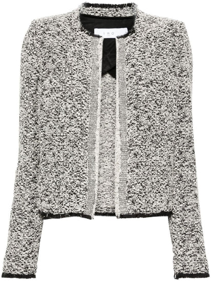 black/white tweed frayed edge round neck open front long sleeves two chest patch pockets two front welt pockets straight hem unlined Hazela cotton blend jacket Size and Fit - This piece fits true to size. We recommend you get your regular size. Model is 1,75m / 5ft 8in wearing size 36 (FR)