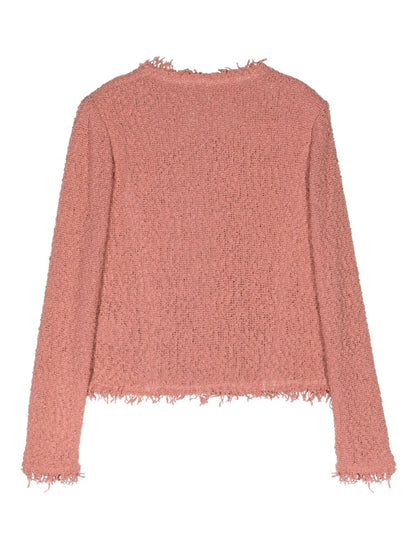 blush pink cotton knitted construction fringed edge round neck open front long sleeves two side welt pockets unlined straight hem Shavani cotton jacket Size and Fit - This piece fits true to size. We recommend you get your regular size. Model is 1,75m / 5ft 8in wearing size 36 (FR)