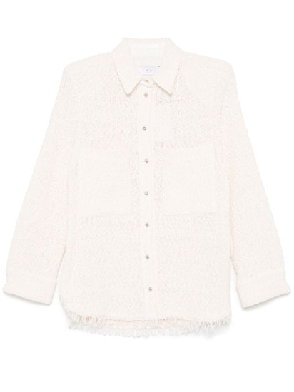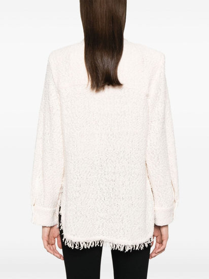 powder pink tweed bouclé construction front press-stud fastening classic collar shoulder pads long sleeves press-stud fastening cuffs two chest patch pockets side slits partial lining frayed curved hem Solaria tweed shirt Size and Fit - This piece fits true to size. We recommend you get your regular size. Model is 1,75m / 5ft 8in wearing size 36 (FR)