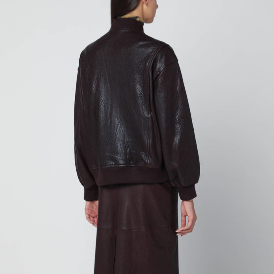 IVY OAK bomber jacket in burgundy lambskin, featuring exposed front zip closure, long sleeves (one with zipped pocket), two front flap pockets with snap buttons, and ribbed knit trims. Size and Fit - Model wears size S Model measurements: Height: 178 cm Chest: 83 cm Waist: 63 cm Hips: 91 cm