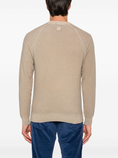 taupe grey cashmere knitted construction logo patch to the rear crew neck long raglan sleeves ribbed cuffs and hem Cashmere crewneck sweater Size and Fit - This piece fits true to size. We recommend you get your regular size. Model is 1,84m / 6ft 1in wearing size M