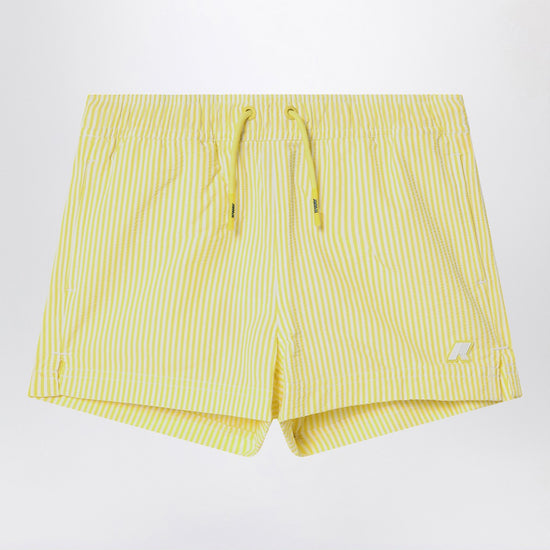 K-Way striped swimsuit in white and yellow, featuring an elasticized waistband with drawstring, mesh lining, two side welt pockets, silicone logo patch on the front, one back pocket with Velcro and logo patch, side slits, and regular fit.