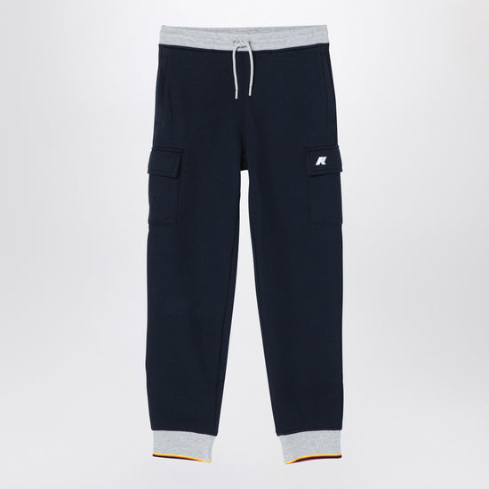 Blue cotton-blend jogging trousers from K-Way, featuring an elasticated waistband with drawstring, two side welt pockets, a patch pocket on the back, two patch cargo pockets with logo patch flaps on the sides and contrasting ribbed hems.