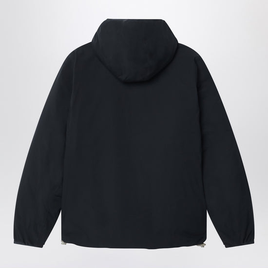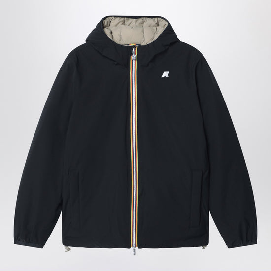 K-Way padded jacket made of waterproof, water-repellent, windproof, and breathable nylon, black on one side and Green Oak colour on the other, characterized by a reversible design, long sleeves, fixed hood, silicone logo patch on the chest, drawstring at the hem, and two side pockets.