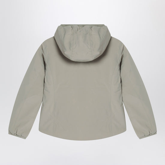 K-Way padded jacket in waterproof, water-repellent, windproof, and breathable fabric, green on one side and gardenia white on the other, featuring reversible design, long sleeves with elastic cuffs, fixed adjustable hood with elastic, silicone logo patch on chest, wadding padding, two side pockets, and regular fit.