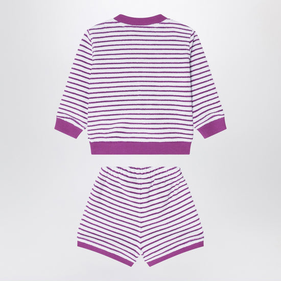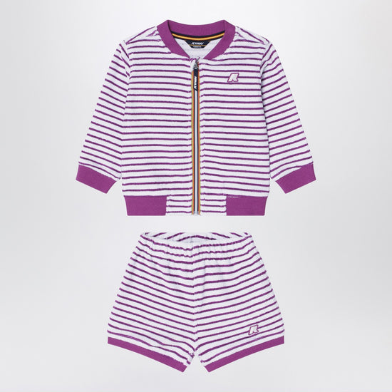 Complete two-piece K-Way in cotton terry with white and purple stripes, consisting of a zip-up sweatshirt, long sleeves, ribbed edges, and a silicone logo patch on the chest, and shorts with an elastic waistband and ribbed edges.