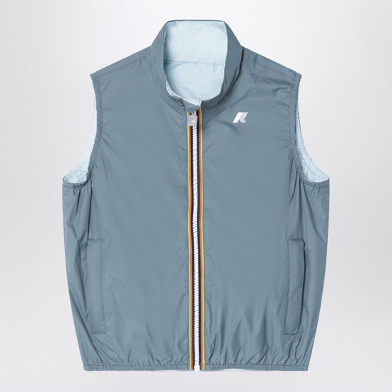 K-Way gilet in waterproof nylon in light blue and dark green, characterized by a reversible design, front zip closure, logo on the chest, elasticated edges, and two side welt pockets.
