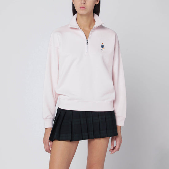 Maison Kitsuné light pink cotton sweatshirt, featuring a half zip at the front, long sleeves, ribbed edges, logo patch on the chest, and a comfortable fit. Size and Fit - Model wears size X S Model measurements: Height: 178 cm Chest: 83 cm Waist: 63 cm Hips: 91 cm