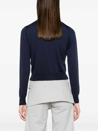 navy blue wool fine knit tonal stitching embroidered logo at the chest round neck long sleeves ribbed cuffs and hem front button fastening Baby Fox wool cardigan Size and Fit - This piece fits true to size. We recommend you get your regular size. Model is 1,75m / 5ft 8in wearing size S