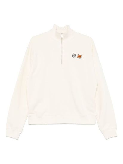 beige half front zip fastening long sleeves signature fox motif ribbed cuffs and hem Double Bold Fox Head cotton sweatshirt