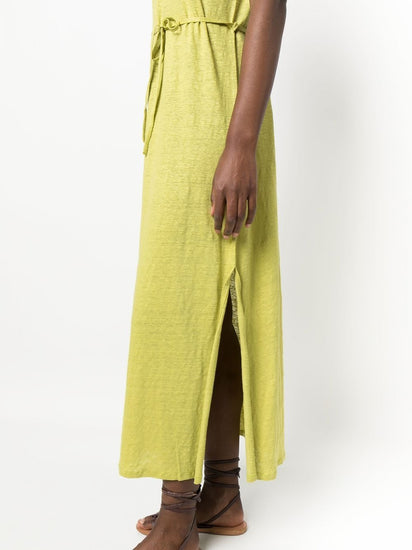 U-neck short-sleeve dress from MAJESTIC FILATURES featuring green, stretch-cotton, U-neck, belted waist, short sleeves, side slit and straight hem. Linen blend long dress Size and Fit - This piece fits true to size. We recommend you get your regular size. Model is 1,75m / 5ft 8in wearing size 1 (NUM)
