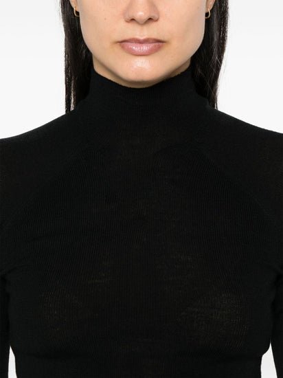 black merino wool blend roll neck short raglan sleeves straight hem Wool and silk blend high-neck sweater Size and Fit - This piece fits true to size. We recommend you get your regular size. Model is 1,75m / 5ft 8in wearing size 1 (NUM)