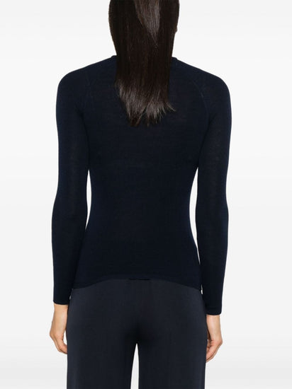 navy blue merino wool blend fine knit brushed effect roll neck long raglan sleeves straight hem Wool and silk blend high-neck sweater Size and Fit - This piece fits true to size. We recommend you get your regular size. Model is 1,75m / 5ft 8in wearing size 1 (NUM)
