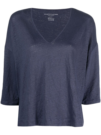 V-neck three-quarter sleeved top from MAJESTIC FILATURES featuring blue, linen blend, stretch-design, V-neck, three-quarter length sleeves and straight hem. This item contains at least 50% materials which are certified or widely recognised as having a lower environmental impact through production and/or manufacturing processes that reduce water consumption and the use of harmful chemicals, or re-use by-products of the production process.. V-neck linen blend sweater Size and Fit - This piece fits true to size. We recommend you get your regular size. Model is 1,75m / 5ft 8in wearing size 1 (NUM)