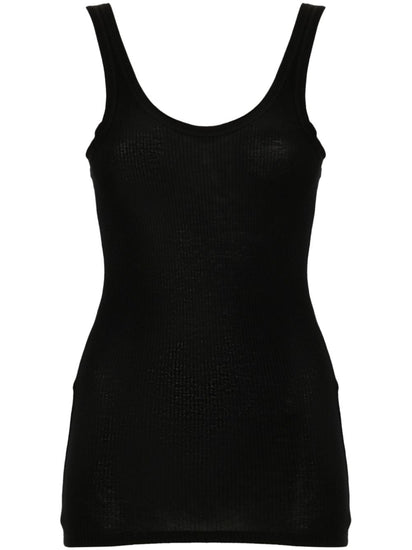 black stretch-design ribbed knit scoop neck sleeveless straight hem Ribbed viscose tank top Size and Fit - This piece fits true to size. We recommend you get your regular size. Model is 1,75m / 5ft 8in wearing size 1 (NUM)