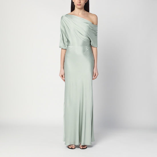 Long dress by Malina in light green satin, characterized by an asymmetrical neckline, short sleeve, draped details, and a hidden zip on the side. Size and Fit - Model wears size S Model measurements: Height: 179 cm Chest: 82 cm Waist: 65 cm Hips: 90 cm