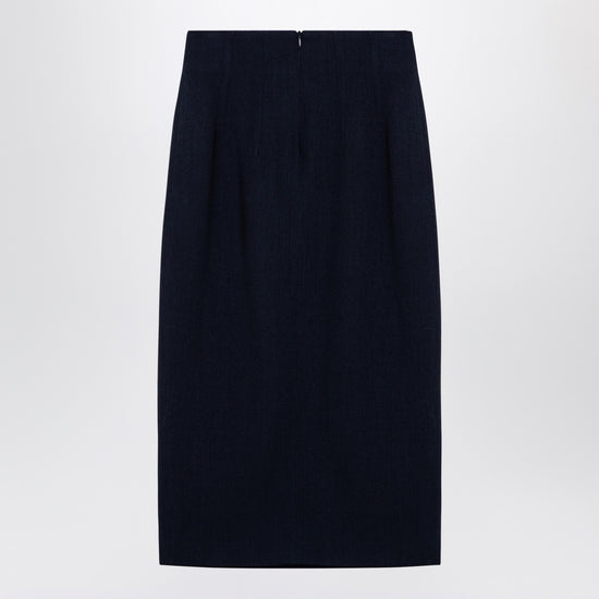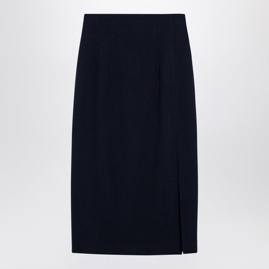 Navy blue virgin wool blend midi skirt from Margaux Lonnberg featuring a high waist, side slit and back zip fastening. Size and Fit - Model wears size 36 FR Model measurements: Height: 178 cm Chest: 77 cm Waist: 60 cm Hips: 87 cm