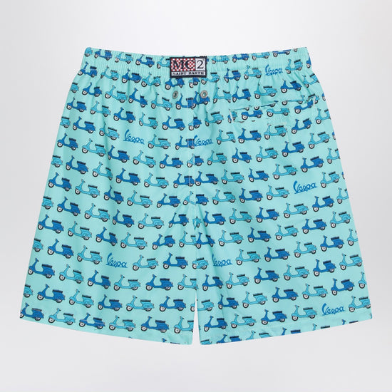 MC2 Saint Barth swimsuit in lightweight quick-drying fabric in light blue, featuring an all-over contrasting Vespa print, elasticized waist with drawstring, two side welt pockets, one back patch pocket with flap, rear eyelets, and a rear logo patch.