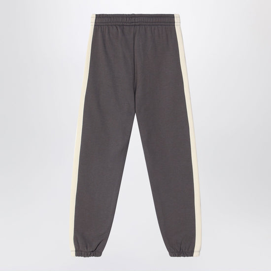 Grey organic cotton jogging trousers by Mini Rodini featuring an elasticated waistband with small logo plaque and beige side stripe.