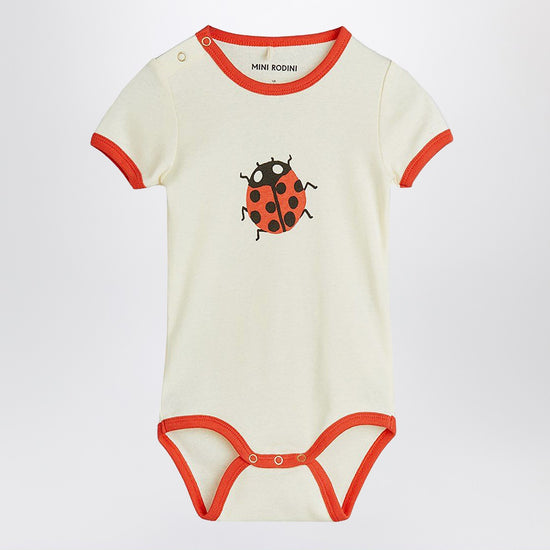 Ivory cotton body by Mini Rodini, characterized by short sleeves, red edges, ladybug on the front, and snap buttons on the crotch and shoulder.