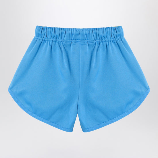 Short by Mini Rodini in light blue recycled fabric, featuring an elasticated waistband with drawstring, rounded hem, and contrasting yellow side stripes.