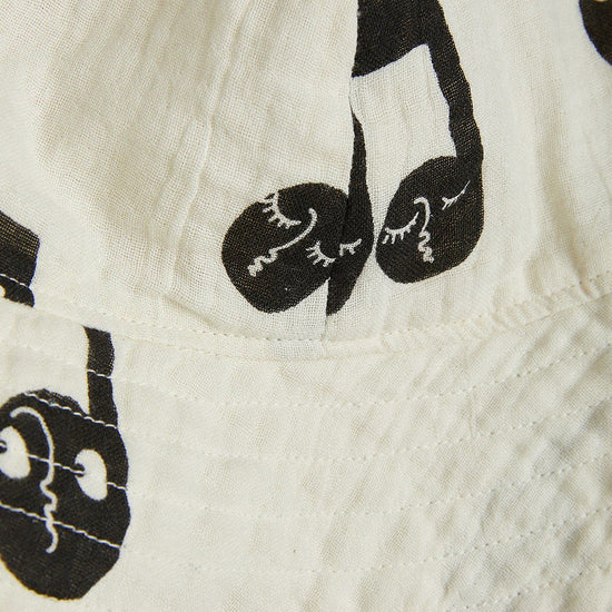 Mini Rodini cotton fisherman hat in white with contrasting musical notes all over and ties to knot under the chin.