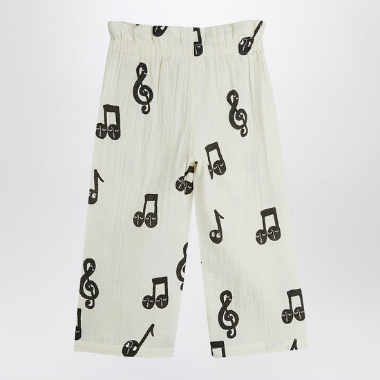 Mini Rodini pants in white cotton with contrasting musical notes all over, characterized by a high elasticized waist and straight wide leg.