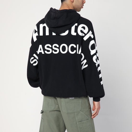 New Amsterdam Surf Association black cotton sweatshirt, featuring long sleeves, contrasting logo lettering print on the back, hood with drawstring, a front kangaroo pocket, ribbed edges, and an oversized fit. Size and Fit - Model wears size L Model measurements: Height: 189 cm Chest: 104 cm Waist: 78 cm Hips: 95 cm