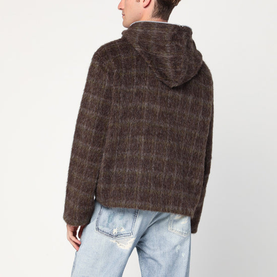 Our Legacy fleece in a fluffy wool blend check pattern, featuring a front closure with visible double zip, long sleeves, a zip hood, straight hem, and a comfortable fit.