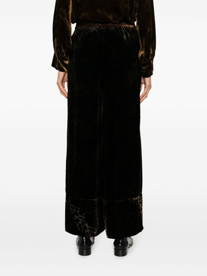 dark green velvet leopard print wide leg elasticated waistband two side inset pockets Silk printed trousers
