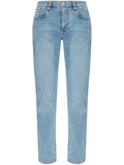 blue front button fastening belt loops classic five pockets Tapered denim cotton jeans Size and Fit - This piece fits true to size. We recommend you get your regular size. Model is 1,84m / 6ft 1in wearing size 32 (WAIST CM)