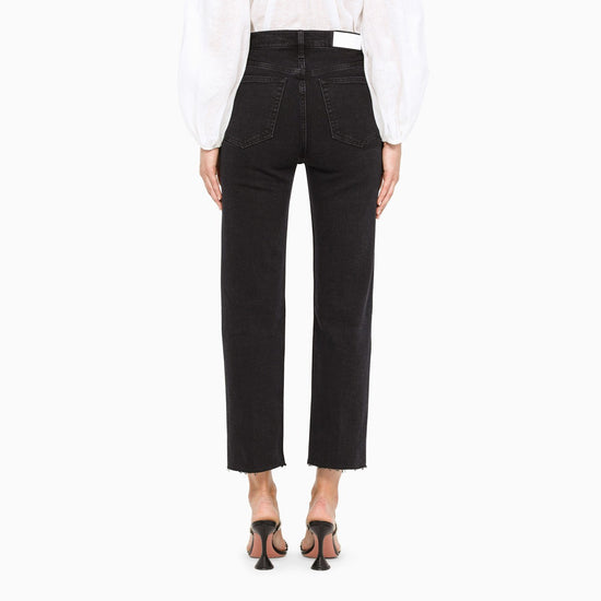 Black trousers by RE/DONE, featuring frontal closure with zip and button, belt loops at the waist, three pockets on the front and two on the back, tone on tone finishes and contrasting patch logo. Size and Fit - Model wears size 27 Model measurements: Height: 180 cm Chest: 84 cm Waist: 64 cm Hips: 91 cm