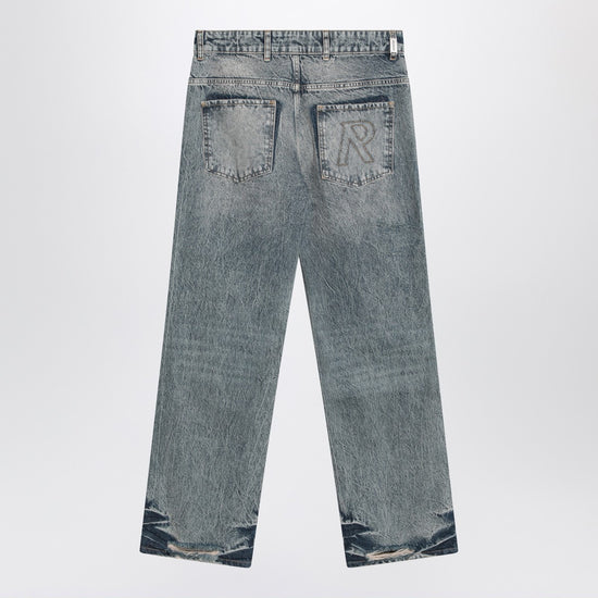 Represent jeans in blue cotton denim with a faded effect, characterized by a front closure with zip and button, belt loops including one with a logo plaque, five classic pockets, stitched logo on the back pocket, and localized rips. Size and Fit - Model wears size 32 Model measurements: Height: 185 cm Chest: 105 cm Waist: 85 cm Hips: 100 cm
