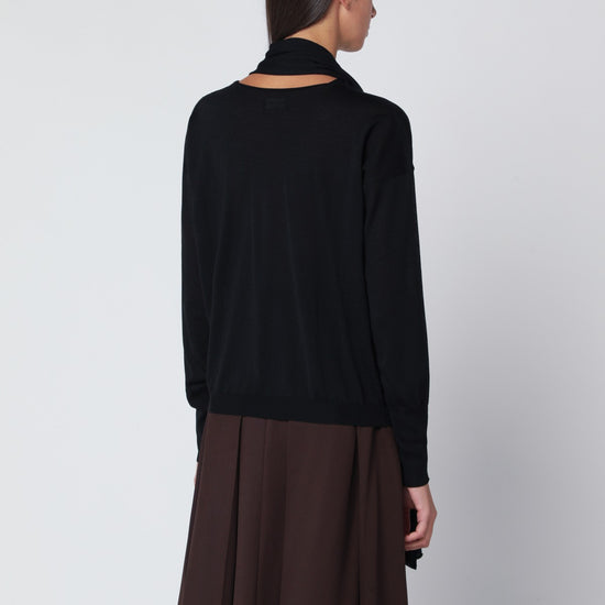 Roberto Collina sweater in black wool, featuring V-neck with scarf to tie around the neck, long sleeves, dropped shoulders, and ribbed trims. Size and Fit - Model wears size S Model measurements: Height: 178 cm Chest: 83 cm Waist: 63 cm Hips: 91 cm