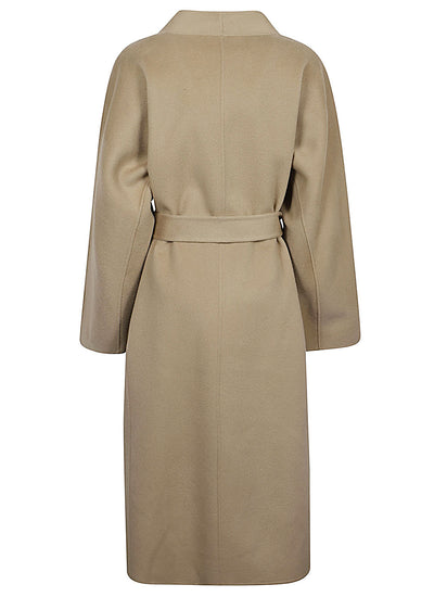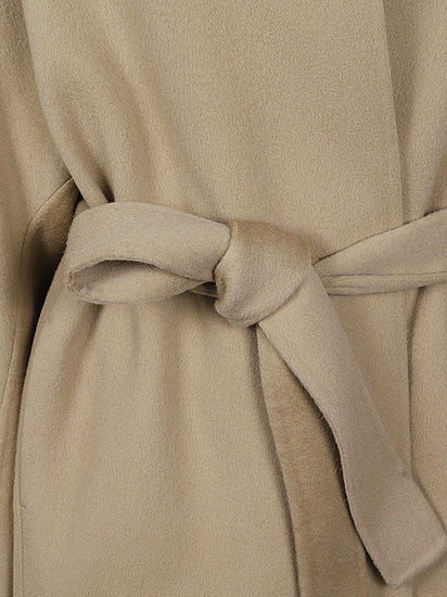Long minimal black coat made of wool, long sleeves, mandarin collar, open on the front, belt, two welt pockets on the front, contrasting stitching. Wool midi coat Size and Fit - This piece fits true to size. We recommend you get your regular size. Model is 1,75m / 5ft 8in wearing size S