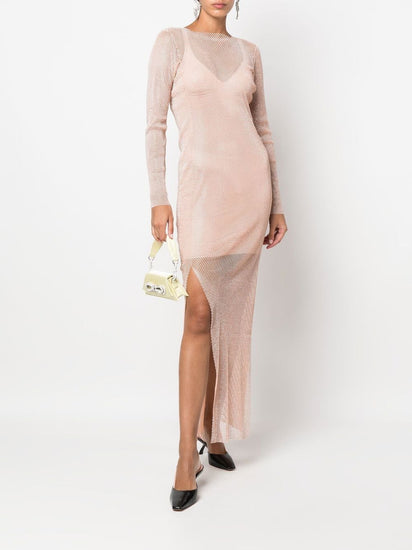 rhinestone-embellished sheer maxi-dress from SANTA BRANDS featuring blush pink, cotton blend, rhinestone embellishment, semi-sheer construction, round neck, long sleeves, side slit and mid-length. Rhinestones embellished long dress Size and Fit - This piece fits true to size. We recommend you get your regular size. Model is 1,75m / 5ft 8in wearing size UNI