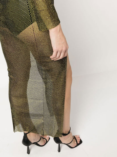 Diamonds rhinestone-embellished mesh maxi dress from Santa Brands featuring black, mesh detailing, rhinestone embellishment, semi-sheer construction, round neck, long sleeves, side slits, rear zip fastening and ankle-length. Rhinestones embellished long dress Size and Fit - This piece fits true to size. We recommend you get your regular size. Model is 1,75m / 5ft 8in wearing size UNI
