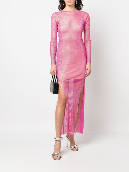 rhinestone-embellished maxi dress from SANTA BRANDS featuring rose pink, semi-sheer construction, rhinestone embellishment, round neck, long sleeves and maxi. Rhinestones embellished long dress Size and Fit - This piece fits true to size. We recommend you get your regular size. Model is 1,75m / 5ft 8in wearing size UNI