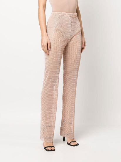 rhinestone-embellished straight trousers from Santa Brands featuring powder pink, rhinestone embellishment, crystal embellishment, semi-sheer construction, high-waisted, elasticated waistband and straight leg. Sparkling trousers Size and Fit - This piece fits true to size. We recommend you get your regular size. Model is 1,75m / 5ft 8in wearing size S
