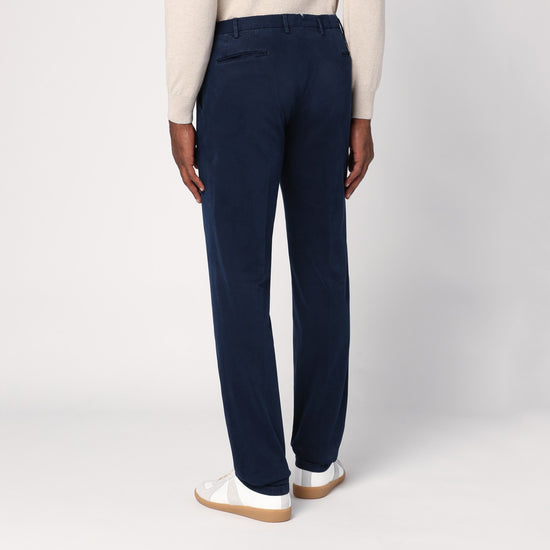 Blue cotton Santaniello trousers featuring a front fastening, waist loops, two side welt pockets and two back welt pockets. Size and Fit - Model wears size 48 IT Model measurements: Height: 187 cm Chest: 102 cm Waist: 76 cm Hips: 92 cm