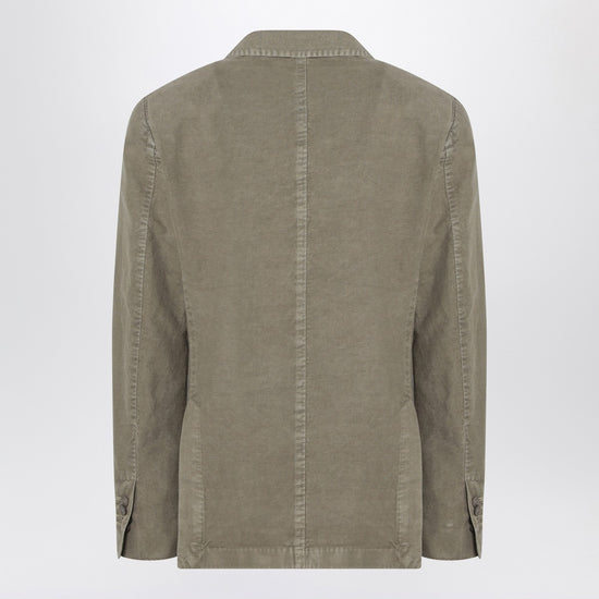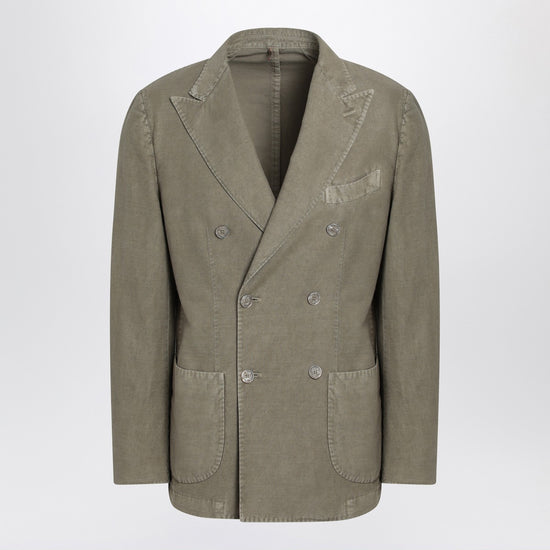 Double-breasted jacket by Santaniello in sage green cotton and linen, characterized by lance lapels, two applied pockets on the front, a welt pocket on the chest, long sleeves with buttoned cuffs, front buttoning, and a double vent at the back. Size and Fit - Model wears size 48 IT Model measurements: Height: 187 cm Chest: 102 cm Waist: 76 cm Hips: 92 cm