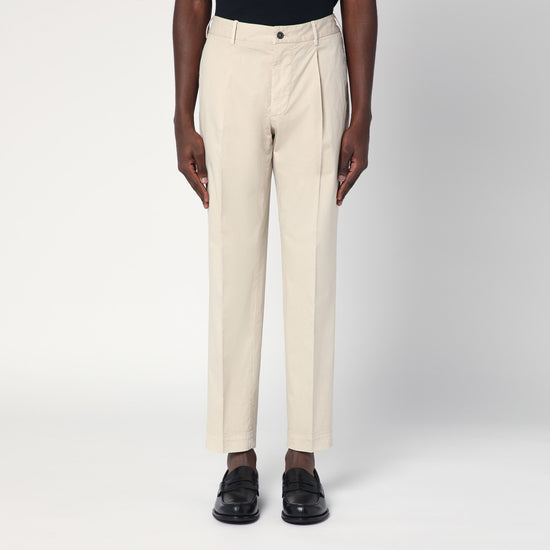 Ivory cotton Santaniello pants, characterized by a front closure with zip and button, elasticized waistband with belt loops at the back, two side welt pockets, two flap pockets with button at the back, and a crease at the front. Size and Fit - Model wears size 48 IT Model measurements: Height: 187 cm Chest: 102 cm Waist: 76 cm Hips: 92 cm