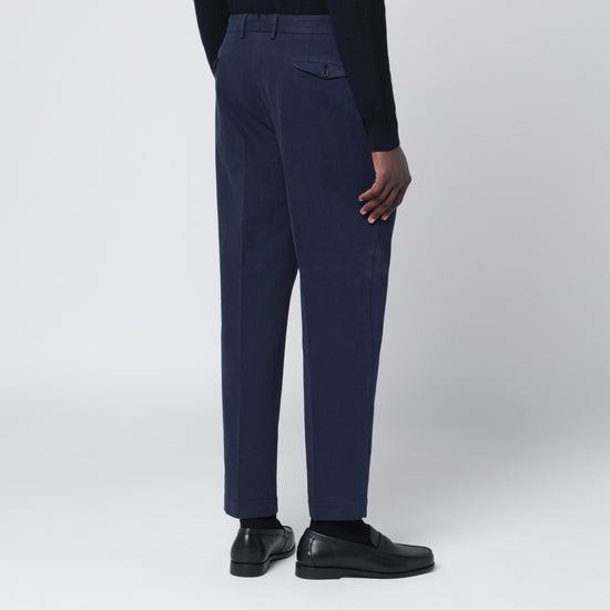 Santaniello navy blue cotton and silk trousers, featuring belt loops, two welt side pockets, two back flap pockets with buttons, front crease, and front closure. Size and Fit - Model wears size 48 IT Model measurements: Height: 193 cm Chest: 95 cm Waist: 78 cm Hips: 86 cm
