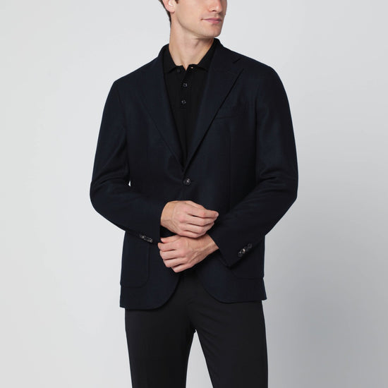 Single-breasted jacket by Tagliatore in blue wool, featuring front button fastening, long sleeves with buttoned cuffs, classic lapels, two front pockets, one welt pocket on the chest and double rear vents.