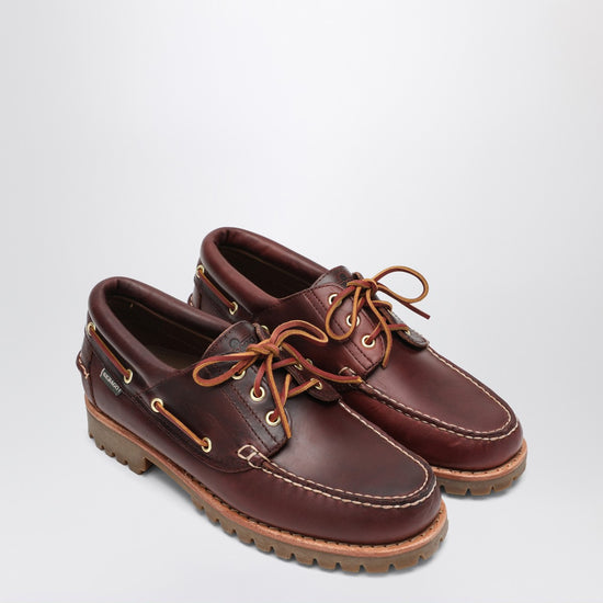 Sebago moccasin made with smooth bordeaux leather upper, characterized by leather laces, hand stitching, side label with logo, and rubber serrated sole.