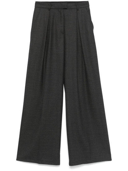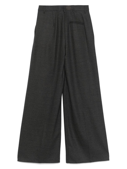 charcoal grey virgin wool blend twill weave palazzo design concealed front button, hook and zip fastening belt loops inverted pleat two side slash pockets rear jetted pocket wide leg Jacob wool trousers Size and Fit - This piece fits true to size. We recommend you get your regular size. Model is 1,75m / 5ft 8in wearing size 40 (IT)